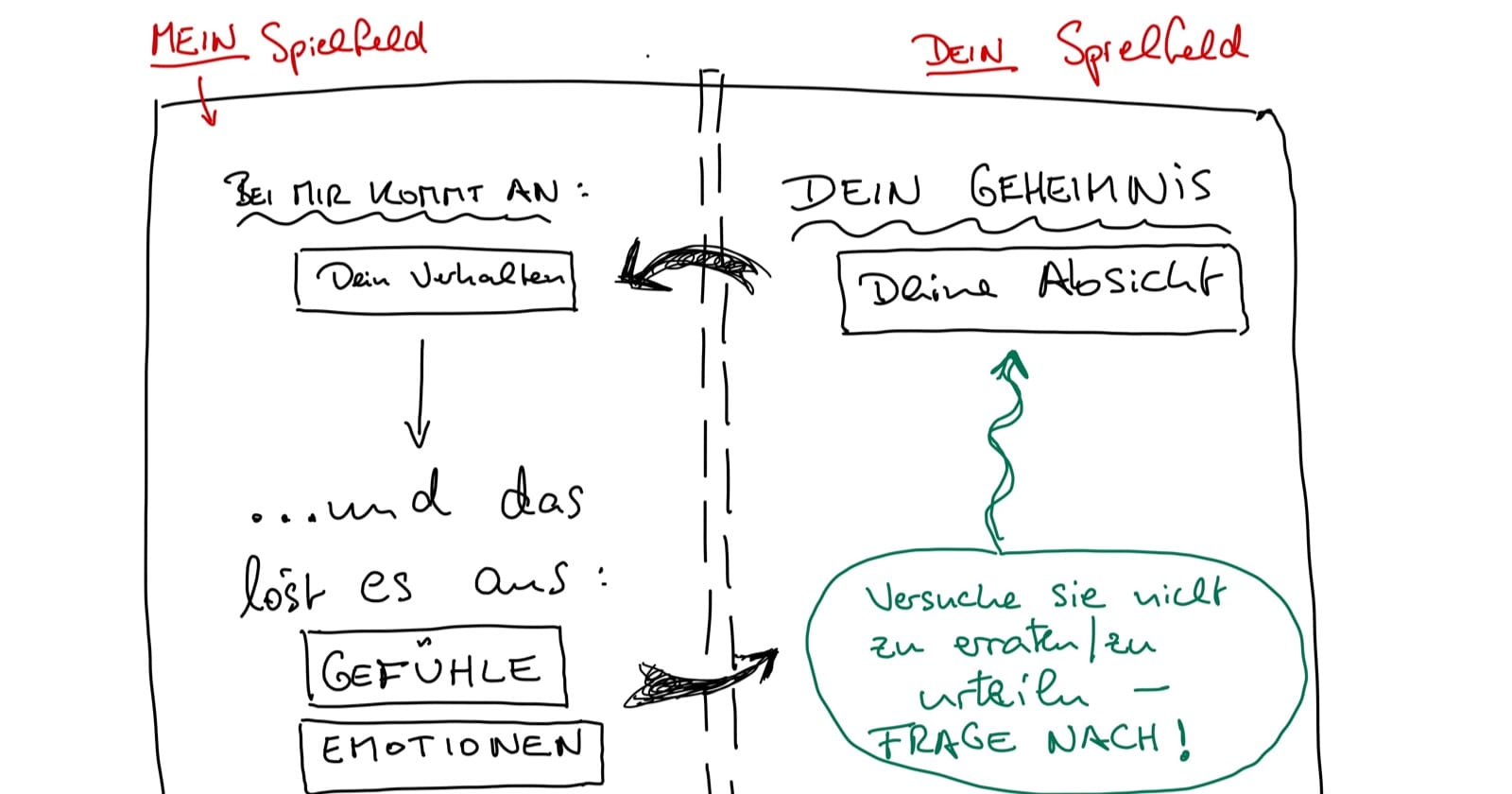 What happens when we only stay in our field? We observe. We note the other person’s behaviour and words and what they trigger in us — feelings, reactions, actions. Nothing more. That’s all that reaches us. Staying with the tennis metaphor: the other person hit the ball with their racquet to our side and has to wait for the ball to come back. Either it returns as expected or surprisingly as a drop shot just behind the net, a smash, or a long ball down the sideline.